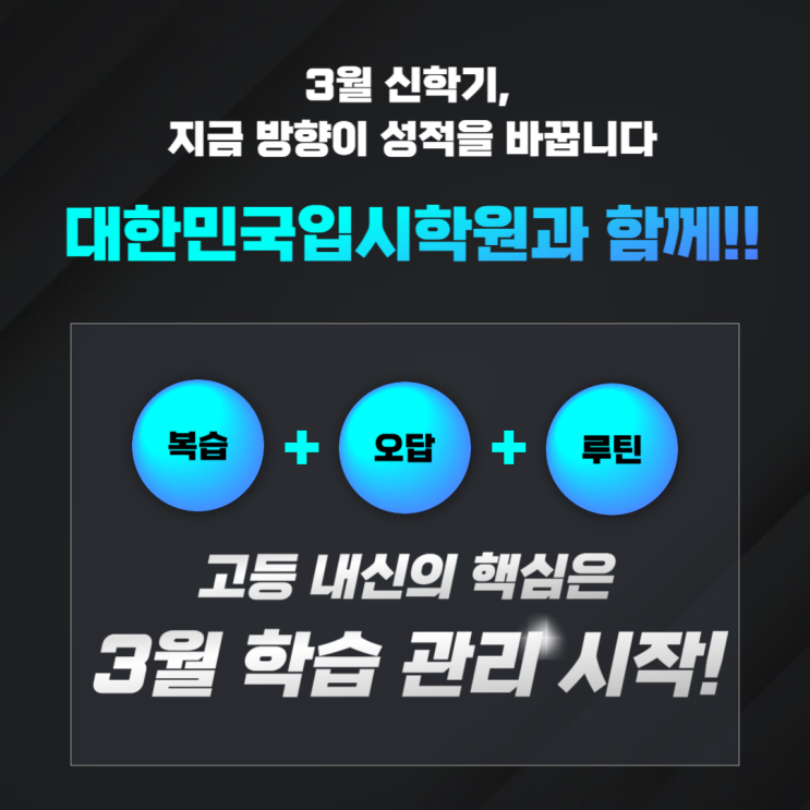 수성구입시학원, 3월부터 달라져야 합니다: 고등 내신은 ‘양’이 아니라 ‘누적 관리’입니다 안녕하세요, 대한민국입시학원입니다. 3월 신학기가 시작되면 많은 학생들이 이렇게 생각합니다. “일단 학교 적응부터 하고, 시험 가까워지면 그때 열심히 하면 되지.” 하지만 고등 내신은 이 방식으로는 결과가 잘 나오지 않습니다. 고등 성적은 시험 2주 전의 집중력보다, 3월부터 쌓인 관리의 힘으로 결정되는 경우가 훨씬 많기 때문입니다. 특히 학부모님 상담을 하다 보면 이런 말씀을 많이 하세요. “아이도 공부는 하는데 성적이 안 나와요.” “분명히 시간은 쓰는데 결과가 아쉬워요.” “시험기간만 되면 너무 급해져요.” 이럴 때 점검....... <img src="https://blogthumb.pstatic.net/MjAyNjAyMjNfMjIw/MDAxNzcxNzgwNzI5ODM2.WTAAaBUELV6J5FaFz6R3Nq7nS-7PaTMFvTr0PHNskaQg.RwejyoOd7g2dPw36VLzQeCRH41iRtfBVqwtFrrr548sg.PNG/%B4%EB%C7%D1%B9%CE%B1%B9%C0%D4%BD%C3%C7%D0%BF%F8_%BA%B9%BB%E7%BA%BB-003_%2810%29.png?type=s3" />