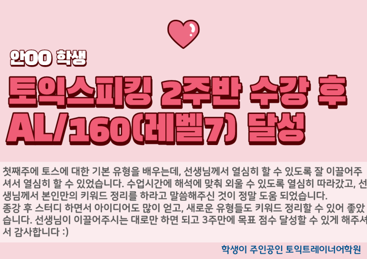 오늘은 토익트레이너에서 선생님의 피드백과 만능 템플릿으로 좋은 점수를 얻은 안OO 학생의 후기를 알아봅시다 (๑•᎑•๑) 1. 첫째주 후기 첫째주는 토익 스피킹 기본 유형에 대해 천천히 배우면서, 매일 매일 과제하면서 천천히 토스를 익혔어요 선생님이 수업 중간중간 재밌는 이야기도 해주시고 열심히 할 수 있게 잘 이끌어주셔서 더 열심히 할 수 있었어요. 여러 학생들이랑 다같이 크게 말할 수 있어서 평소 부끄러움이 많은 성격인데도 그냥 같이 크게 말할 수 있었어요. 2. 둘째주 후기 1주차 주말에 템플릿을 꼭 외워오라고 강조하셨는데, 사실 이때 제대로 안외워와서 조금 힘들었지만..! 수업시간만큼에는 해석에 맞춰서 외울 수 있....... <img src="https://blogthumb.pstatic.net/MjAyNjAyMDVfNzIg/MDAxNzcwMjg0NzAwMDY5.EtEFxxdJ3WeJYGW9kWvf1iZLp6IILK9c6XHop4D1OkYg.7h2uegwSAWF_oMZQGtE36nEPAv3yX3_kYBx-njWdifIg.PNG/%BE%C8%C3%A4%BF%F8%28%BE%C8OO%29.png?type=s3" />