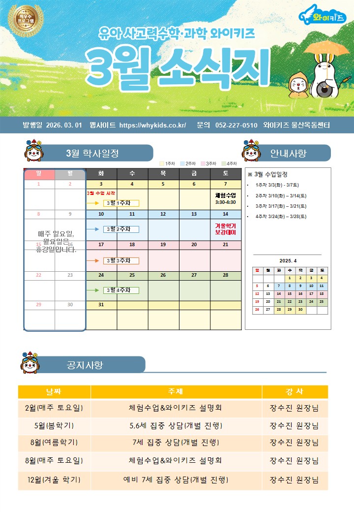 봄바람이 살랑이고 새싹이 피어나는 새학기가 시작되었습니다. 와이키즈 친구들도 봄처럼 활기차고 신나는 3월이 되길 기대합니다. 2026년 3월 소식지도 꼼꼼히 살펴봐주세요.^^ <img src="https://blogthumb.pstatic.net/MjAyNjAyMjNfNzAg/MDAxNzcxODIzNzY5NTg0.z4cyZmAUl4oQ_rh1FmL-ex_ix11JXupS1sYMKhI4vcAg.Zl8yemVNpsdhFt_uF5TVUrHN03WFyAsitMJTPO_tJjwg.JPEG/%BD%BD%B6%F3%C0%CC%B5%E50001.jpg?type=s3" />