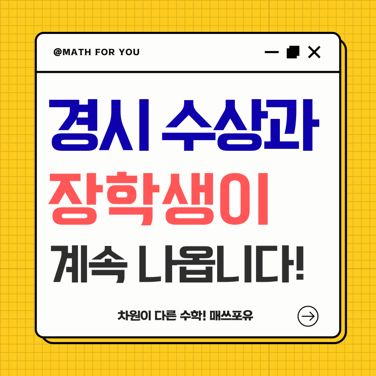 26년 새해가 바뀌고, 어느 덧 1월도 얼마 남지 않았습니다. 항상 친절하고 집요하게 가르치는 매쓰포유입니다. 방학이지만 무거동 장검수학학원 매쓰포유의 면학 열기는 그 어느 때보다 뜨겁습니다. 느슨해지기보다는, 대다수의 원생들이 방학 특강 수업까지 병행해 수업하며, 오히려 지금이 실력을 끌어올릴 수 있는 가장 좋은 시기라는 것을 스스로 알고 있는 듯한 모습이라..., 어느 때보다 이들의 표정이 진지하기 그지없습니다.^^ 이런 분위기 속에서 무거동 장검 수학학원 매쓰포유의 책임감도 더욱 커지고 있습니다. 오늘은 이런 열공 분위기 속에서 최근의 따뜻한 학원 소식 두 가지를 전해 볼까 합니다. 25년 2학기 성적우수자 장학금 대....... <img src="https://blogthumb.pstatic.net/MjAyNjAxMjZfMTg1/MDAxNzY5NDA2MDc4NjY1.N52cO_cfQ8VPuK-Y8a_-guhpUxaKTnzF8XnuSE0XiGcg.Pius6adg-hikEaDx77s79nUPFxuhlwzSH3g_XkmDpQgg.PNG/%BD%E6%B3%D7%C0%CF_260125.png?type=s3" />