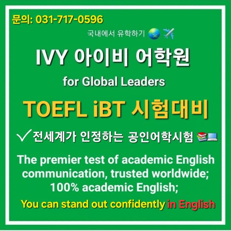 For Global Leaders with IVY 아이비 어학원 Specialized in Diagnostic Tailored Curriculum ● 자신만만 의사소통 중심의 영어교육 ● 유학 전문가들의 전략적 국제 학교 커리큘럼 ● 영역별 정확한 진단평가 맞춤형 수업 학습코칭 학생들이 토플을 선택하는 이유 영어 실력을 넘어서, 당신의 미래를 여는 열쇠 토플은 단순한 시험이 아닙니다. 실제 대학 환경에서 성공할 수 있는 준비 정도를 보여주는 평가입니다. 토플의 장점: 전 세계가 인정한 시험, 압도적인 신뢰도 미국, 영국, 캐나다, 호주, 독일의 모든 대학과 전 세계 수천 개의 다른 주요 대학을 포함하여 160 개국 이상에서 13,000+ 개 기관이 인정합니다. 공정하고 객관적으로, 당....... <img src="https://blogthumb.pstatic.net/MjAyNjAyMjVfMTM3/MDAxNzcyMDIyMTcyNDA0.syHAomqgcOJ6GFk9NplVPN_aZ1nuRo4PRKOL9F7OGhUg.XrsgOt7F6E7Zodecc82a1auhwkV9eW_TdSmSqq5yeFkg.JPEG/KakaoStory_2022_12_03_00_57_10.jpg?type=s3" />