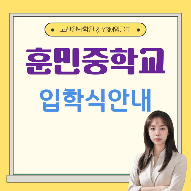 안녕하세요 고산신도시 교육중심 고산원탑학원 수지쌤입니다 새학년이 시작되는 설렘 반 기대 반으로 3월을 맞이하는 탑둥이들입니다 탑둥이들이 가장 많이 진학하는 학교 중 하나인 훈민중학교의 개학 및 입학 일정이 공지되었습니다 설레는 새 학기 첫날부터 당황하지 않도록 핵심 내용을 정리해 드릴게요 꼭 체크하세요! 주요 일정 새 학기 준비의 시작은 반 편성 확인부터겠죠? 반 편성 발표 2월 27일(금) 오전 10시 (학교 홈페이지) 1학기 시간표 안내 2월 27일(금) 오전 11시 (학교 홈페이지) 등교 시간 오전 8시 50분까지 완료 등교 준비물 및 복장 첫날은 챙길 것이 많으니 미리 확인해 주세요. 복장 단정한 교복 차림 준비물 책가방, 필....... <img src="https://blogthumb.pstatic.net/MjAyNjAyMjRfMjQ4/MDAxNzcxOTE4NDY5OTI4.XaoB54obGP5DmEL6rU_Ab3QfSoNf7igQ5444I6Jn3TUg.zGka-NuJd3eTUZT7or_sdNjpJBeEYMmitGo9-gsi_xkg.PNG/%C8%C6%B9%CE%C1%DF%BE%CB%BE%C6%BA%B8%B1%E2_%281%29.png?type=s3" />