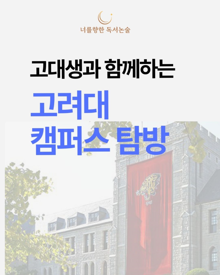 고대생과 함께 하는 고려대 캠퍼스 탐방 안녕하세요. <너를향한 독서논술>입니다. 중학생 친구들을 대상으로 고려대 재학생과 함께하는 캠퍼스 탐방을 진행합니다. 대학을 단순히 둘러보는 시간이 아니라, 아이들이 자신의 미래를 조금 더 구체적으로 그려볼 수 있는 의미 있는 시간이 될 예정입니다. 고려대 재학생과 함께하는 멘토링 캠퍼스 투어 이번 탐방에서는 고려대 재학생 멘토와 함께 캠퍼스를 걸으며 다양한 이야기를 나누게 됩니다 . ✔ 전공을 선택하게 된 과정 ✔ 중·고등학생 시절의 준비 이야기 ✔ 실제 대학 생활과 공부 방식 ✔ 진로에 대한 현실적인 조언 아이들이 평소 궁금했던 것들을 편안하게 질문하....... <img src="https://blogthumb.pstatic.net/MjAyNjAyMjNfMjc3/MDAxNzcxODUyOTUxOTcy.rTu6QiG8hivqQriKxYxfmrGfpJplNnWLVbJj5wK8zP8g.rBG7fBDd0T3ZhFAft5HvZ7g9D7q1A74sEsJhqdQaMtYg.PNG/image.png?type=s3" />