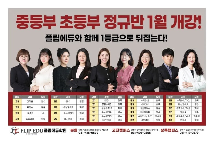 안녕하세요 플립에듀학원 고잔캠퍼스(중앙프라자4층)입니다. 1월 12일에 중3 영어 수학 개강합니다. <중3 시간표> 수학 : 월수 6시30분~9시 영어 : 화목 4시~6시 (개학후 7시로 이동예정) 문의 : 010-9795-9535 #안산영어학원 #플립에듀학원 #안산수학학원 #고잔동영어학원 #고잔동수학학원 <img src="https://blogthumb.pstatic.net/MjAyNjAxMDhfMTAg/MDAxNzY3ODA0MjE4NzU0.s5DQuDfu5gJYWKPndkR7vxW4HoJG6obx6ygDFRWkJZcg.ryOBobW5kIlO6PiR153CSdBidVZTWtfZ8pvfAkG6euYg.JPEG/900%A3%DF1767368319255.jpg?type=s3" />