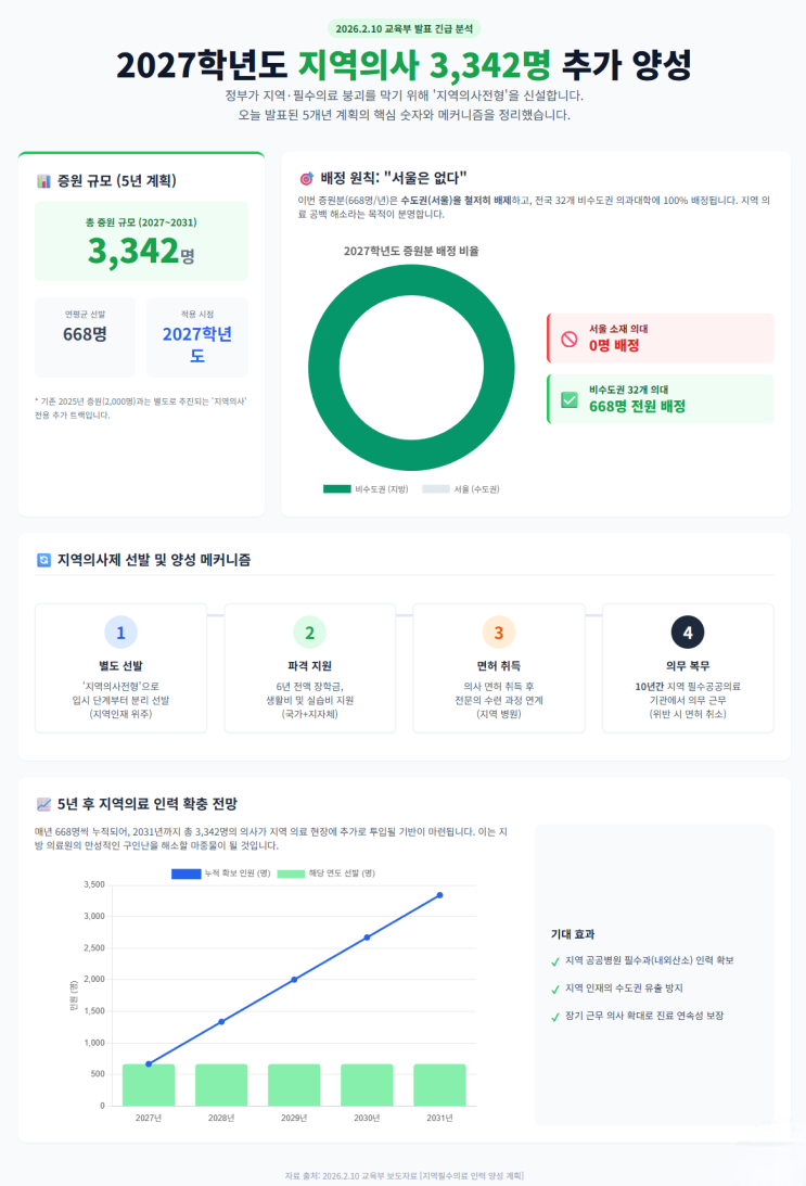안녕하세요. 일산 수학, 영어의 중심 신의 한 수 학원입니다. 2026년 2월 10일 오늘 발표된 의대 정원 확정안은 대한민국 대입 역사에 기록될 거대한 변곡점입니다. 단순히 의대 문턱이 낮아졌다는 표면적인 해석을 넘어 교육 생태계 전반에 휘몰아칠 거대한 변화의 물결을 냉철하게 분석해 보아야 합니다. 이제 막 대입의 중심에 선 고3 학생들과 다시 한번 도전장을 내미는 수험생들에게 이번 발표는 기회인 동시에 감내해야 할 거대한 심리적 압박으로 다가올 것입니다. 가장 먼저 본질을 꿰뚫어 보아야 할 지점은 증원된 490명의 성격입니다. 이번 증원의 핵심은 비수도권 의대 중심의 배분과 지역의사제 도입에 있습니다. 장학금을 대가로 졸....... <img src="https://blogthumb.pstatic.net/MjAyNjAyMTBfMjA2/MDAxNzcwNzE1NTEyMjM0.reTKCAHJYj6q6zi-ExTjI2KsdtMxQKDLDerGa1uUc3wg.LvRRuoGMoxb2tRv18UIlJk06aQydpSq_i3fNhucUEL0g.PNG/1.png?type=s3" />
