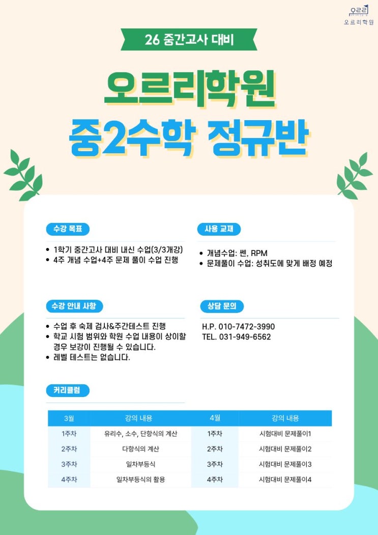 [파주 운정 오르리학원]26년 중간고사 대비 중학 수학 정규반 개설 안