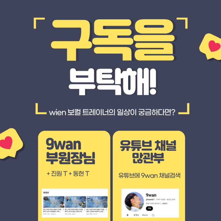 그동안 빈보컬 트레이너의 일상이 궁금하셨던 분들을 위한 일상브이로그를 업로드 하였는데요 9wan 부원장님의 채널에 매주 수요일 영상이 업로드 예정이며, 구독과 좋아요 부탁드리겠습니다 ➡️ 지금 바로 유튜브에 '9wan' 검색하세요! - 상담문의 인스타그램 @wien_vocal DM 0507-1329-0029 #전주보컬 #전주실용음악 #전주보컬전문학원빈 #입시 #취미 #버스킹 #공연 #대회 #노래 #음악 #보컬 #유튜브 #9wan #채널오픈 #많관부 #구독과 #좋아요 <img src="https://blogthumb.pstatic.net/MjAyNTEyMThfMTM3/MDAxNzY2MDUyNjcwODM4.iRFzaE8pSRvmG4PwRb6LF11MAZGrdcWdKhS3sQmmNBgg.ON6gB7lkCOojz1A6Cvbf-yjZTaKSsqeKRGVuDca5Lf0g.PNG/%B1%B8%B5%B6.png?type=s3" />