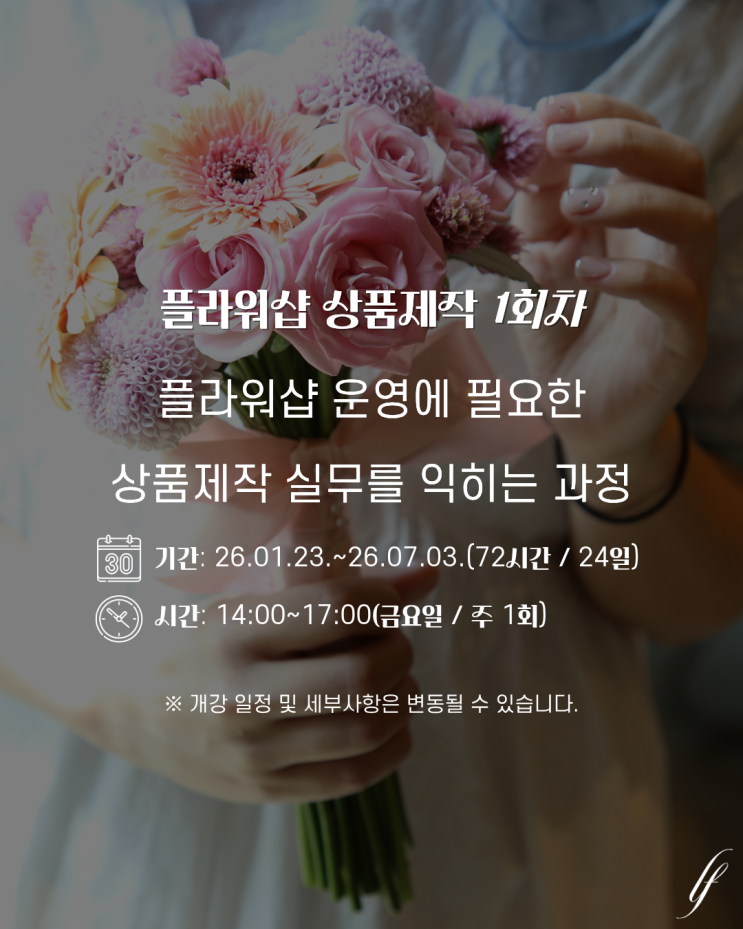✨ ‘예쁘게 만드는 법’을 넘어, ‘잘 팔리는 상품으로 완성하는 법’✨ 년도 플라워샵 상품제작 1회차 과정 안내드립니다〰️ 플라워샵 상품제작 1회차 플라워샵 운영에 필요한 상품제작 실무를 익히는 과정 기간: 26.01.23.~26.07.03.(72시간 / 24일) ⏰ 시간: 14:00~17:00(금요일 / 주 1회) ※ 개강 일정 및 세부사항은 변동될 수 있습니다. 플라워샵 운영에 필요한 상품을 시장성 있게 기획하고 효율적으로 제작하는 기술을 익히는 실전 커리큘럼 훈련 과정 소개 트렌드 분석을 시작으로 소재 선택과 상품 제작부터 마감 퀄리티까지 나만의 손길에 상업적 가치를 더한 실무와 연결된 실용주의 커리큘럼 ....... <img src="https://blogthumb.pstatic.net/MjAyNTEyMThfMjg4/MDAxNzY2MDI2MjAzOTkz.BF_McMwQZV-qGpD-aHCtGDmh0AXgCZH0375FWDowZq4g.6xuHDGNSen8qsaHUxLxBpbFt2I1DN35zfPoNlF7MAFAg.PNG/6%C7%C3%B6%F3%BF%F6%BC%A5_%BB%F3%C7%B0%C1%A6%C0%DB.png?type=s3" />