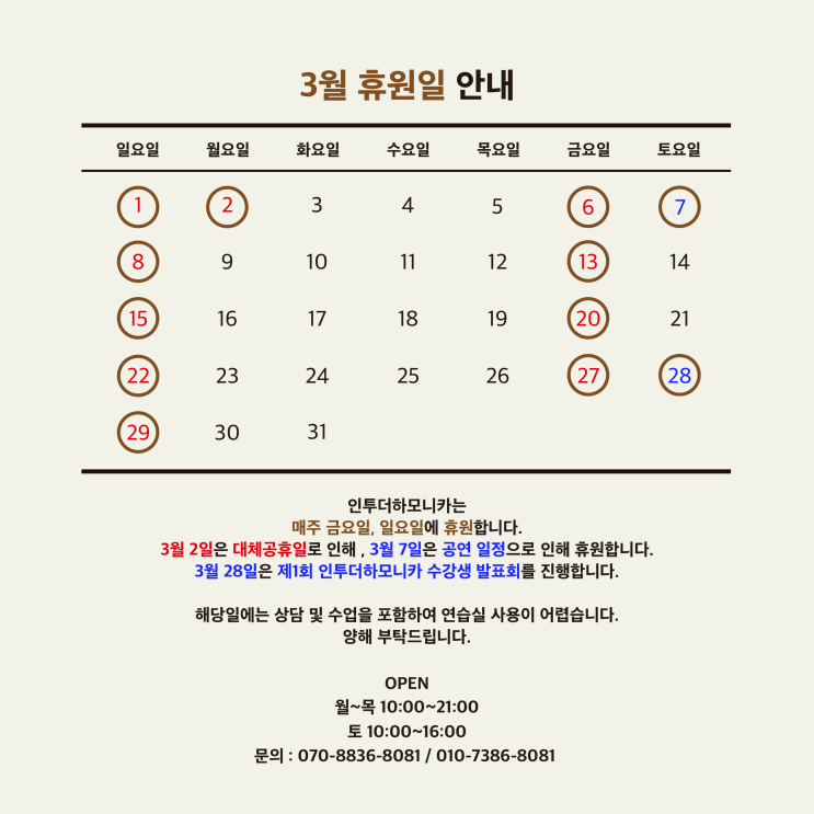 안녕하세요, 인투더하모니카입니다. 따스한 봄기운이 완연한 3월을 맞아, 학원 이용에 차질이 없으시도록 이번 달 휴원 일정과 주요 행사를 안내해 드립니다. ️ 3월 휴원 일정 안내 3월 한 달간 아래 날짜에는 모든 상담, 수업 및 연습실 사용이 불가하오니 일정을 꼭 확인해 주시기 바랍니다. 3월 2일 (월): 대체공휴일로 인한 휴원 3월 7일 (토): 외부 공연 일정으로 인한 휴원 주요 행사 안내 3월 28일 (토): 제1회 인투더하모니카 수강생 발표회 "향상하니까, 하모니카!" 해당일은 발표회 진행으로 인해 일반 수업 및 연습실 사용이 어렵습니다. 수강생 여러분의 많은 응원과 관심 부탁드립니다! ⏰ 운영 시간 안내 (상....... <img src="https://blogthumb.pstatic.net/MjAyNjAzMjBfMTkz/MDAxNzczOTc4NTQ2ODc2.-QoaopBDJkttadVLi6-17q-vc0UI1Xf4dXAP6OUI11Eg.3m1ELGj1W9yz0q8fc4qw75qVlV8XtrpT8c8mHK7nYeMg.PNG/3월_휴원일_안내.png?type=s3" />