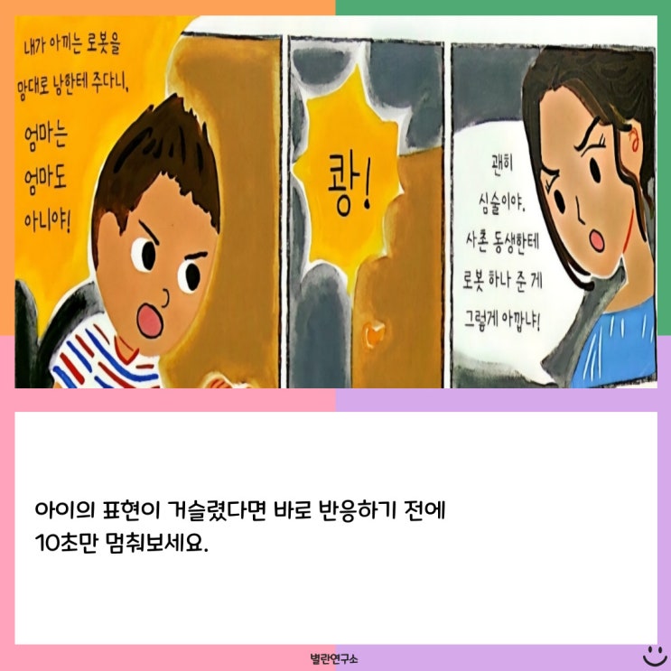 아이가 로봇을 빼앗겼을 때 '엄마는 엄마도 아니야' 라고 화를 냅니다. 그 화는 단순히 '버릇없음'이 아니예요. 그 행동 안에서의 감정의 기능은 -소중함을 지키려는 기능 -경계 설정 기능 -상실에 대한 반응 -자율성 주장 일 수 있습니다. 이렇게 보면 부모의 반응이 달라집니다. 행동만 보지 않고, 그 행동 안에서 감정이 어떤 기능을 하고 있는 지, 아이의 관점은 무엇인지 함께 살펴보세요. 만화그림: [소통 씨는 잘 통해] 김성은 글 ,김진희 그림 참고 아이의 감정 세계가 궁금하신 분은 [아이의 감정] 우도베어, 가브리엘레 프릭-베어 지음 추천 드립니다. 연극과 마음챙김교육을 활용한 사회정서학습을 하는 별란연구....... <img src="https://blogthumb.pstatic.net/MjAyNjAyMjBfMTgx/MDAxNzcxNTY4NDM4NDgz.81m_3v-5CmFzxzGlc_1Svvz9PMUlX9dGq3cgQ3bNvxEg.TycdUb6z3IklH9AwqAVxcZ3MwLKPfOt-kqCoJQcY3s4g.JPEG/%B0%A8%C1%A4%B1%B3%C0%B0%2C%BA%B0%B6%F5%BF%AC%B1%B8%BC%D2%B0%A8%C1%A4%B1%B3%C0%B0%C7%D0%BF%F8%2C%BB%E7%C8%B8%C1%A4%BC%AD%C7%D0%BD%C0%2C%BB%E7%C8%B8%BC%BA%B1%B3%C0%B0%2C%C1%A4%BC%AD%B1%B3%C0%B0%2C%B0%FC%B0%E8%B1%B3%C0%B0%2C%B8%B6%C0%BD%C3%AC%B1%E8%B1%B3%C0%B0%2C%BE%EE%B8%B0%C0%CC%B8%ED%BB%F3%2C%BA%B0%B6%F5%BF%AC%B1%B8%BC%D2%2C%BB%E7%C8%B8%BC%BA%B1%D7%B7%EC_%284%29.jpg?type=s3" />