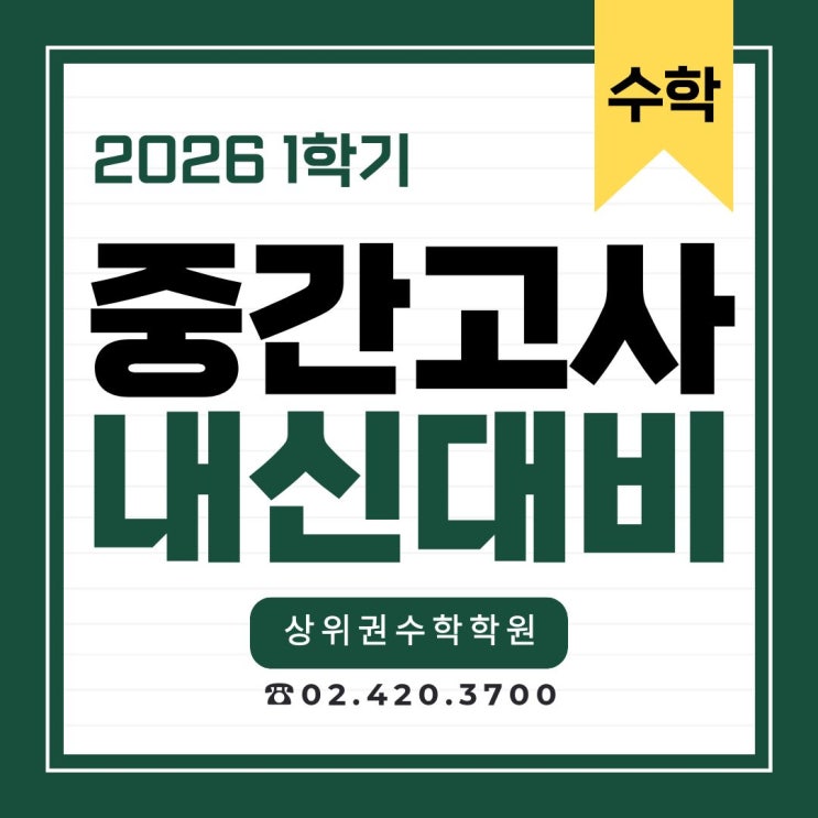 "수학 점수는 '눈'이 아니라 '손' 끝에서 결정됩니다." ▶ 상위권수학만의 6단계 철벽 관리 시스템 ◀ [Step 1] 완벽 이해: 개념의 뿌리부터 흔들림 없는 이해 [Step 2] 유형 정복: 빈틈없는 유형 반복 훈련 [Step 3] 오답 관리: 틀린 문제는 맞힐 때까지 관리 [Step 4] 누적 테스트: 망각 방지! 배운 내용을 끝까지 가져가는 힘 [Step 5] 약점 타격: 개인별 취약 단원 정밀 분석 및 보완 [Step 6] 자신감 완성: 성취감으로 이어지는 고득점 경험 빈틈을 메우면 점수는 반드시 오릅니다. 학교별 부교재와 기출분석 풀이! 철저한 학교별 기출 변형과 자체 내신 교재로, 이번 중간고사 '고득점의 확신'을....... <img src="https://blogthumb.pstatic.net/MjAyNjAzMThfMTY3/MDAxNzczODMwMDU1NTI3.sXEnUdaEgHjLvsJwnTm_7YsbGp1oXk3Wmi48wZZ2VcIg.O3gnYb_TE2Bs8hupDIu_689kE52f8lzMMdO3I2o3-9cg.JPEG/%C1%A6%B8%F1%C0%BB_%C0%D4%B7%C2%C7%D8%C1%D6%BC%BC%BF%E4._%281%29.jpg?type=s3" />
