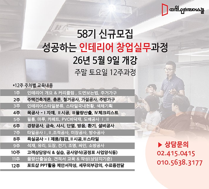 성공창업실무과정 58기개강 5월 9일 토10시 신규모집* 현재접수중> 성공창업 실무과정 58기 ▪ 강의내용 성공하는 인테리어창업이 가능할수 있게 인테리어스타일 과 현장공정을 체계화 공식화 시킨 현실성 있는 인테리어실무과정으로, 고객상담에서부터, 총27개 현장공정의 개요, 제품, 시공법, 핵심감리체크리스트, 물량산출 및 견적서실습과정, 제2의 견적서인 제안서작성법, 온라인마케팅방법이 교육되어집니다. ▪ 강의일정 26. 5. 9 토 ~ 8. 1 토 주말 토 12주 수업 오전 10시~오후 5시 ▪ 강의혜택 - 예일스쿨 자체연구제작 교재제공(4권구성) - 견적자료 : 제품단가,구매처제공, 견적서원본제공 - 시공업체리스트 : 전국시공자리스트 (....... <img src="https://blogthumb.pstatic.net/MjAyNjAzMThfMjgg/MDAxNzczNzk4NzEyNTYx.QSZhosTnprFuD5d6p_21XOhXEz7hHz5h9oyyhPo0f7cg.niiSE9bJZ8bKYlLiSOXAYZEwpUgixl4Szs0GNaPV3ekg.JPEG/%C7%D0%BF%F8%B0%B3%B0%AD_58%B1%E2%B0%B3%B0%AD_%BA%ED%B7%CE%B1%D7_half2.jpg?type=s3" />