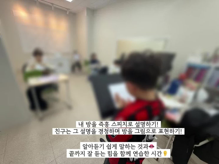 내 방을 즉흥 스피치로 설명하기 친구는 그 설명을 경청하며 방을 그림으로 표현하기 알아듣기 쉽게 말하는 것과 끝까지 잘 듣는 힘을 함께 연습한 시간 즉흥스피치 + 끝까지 듣는 힘! 생각과 태도가 함께 자라는 키즈스피치 수업 이야기 속으로 들어가볼까요? 우선 즉흥스피치와 경청 훈련 활동 수업을 잘한 아이들의 영상 잘 보셨나요? 영상을 아직 안 보셨다면, 영상 먼저 보고 오세요~ 친구들 앞에서 용기있게 즉흥 스피치로 발표하는 아이들의 모습과 친구의 발표를 경청의 자세로 잘 듣고 있는 아이들의 모습 보셨을까요? 우리 아이도 용기있게 발표하고, 친구들의 이야기를 귀 기울리면서 잘 듣는 습관으로 키우고 싶으신가요? 그럼 !!!!!....... <img src="https://phinf.pstatic.net/image.nmv/blog_2026_03_17_2579/nPYBOKYHPH_01.jpg?type=f480x480" />