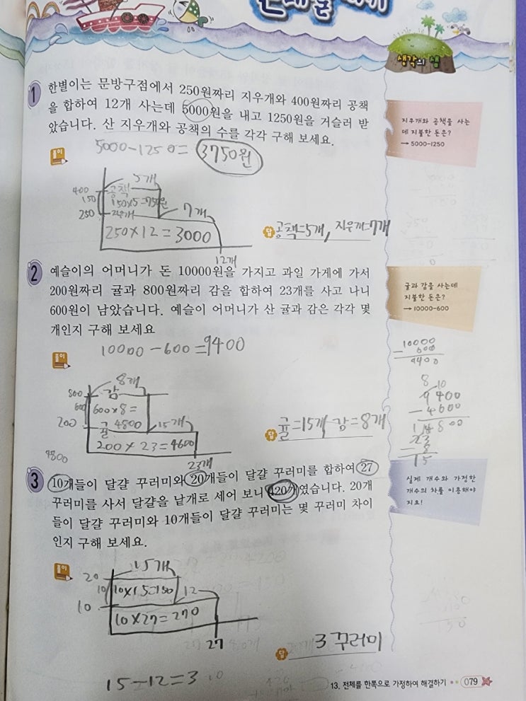 수학 문장제 시간 초등 수학에서 가장 중요한 능력은 -계산 잘하기’보다 ‘문제를 정확히 이해하는 힘’-입니다. 글로 된 문제(문장제)를 읽고도 무엇을 묻는지 몰라 손을 못 대는 아이들이 정말 많습니다. 동광학원 초등수학 수업은 이 부분을 가장 핵심으로 지도합니다. 문제를 도식(그림)으로 구조화하고 상황을 눈으로 이해한 뒤 식으로 연결하는 방식입니다. 아래는 실제 수업 시간에 다룬 문제 풀이 사례입니다. --- 문제 ① 문방구에서 지우개와 공책 사기 250원 지우개 + 400원 공책을 합해 12개 구매, 5000원을 내고 1250원을 거슬러 받았다. 각각 몇 개를 샀을까? ✅ 1단계 ― 전체 금액 파악 총 사용 금액부터 계산합....... <img src="https://blogthumb.pstatic.net/MjAyNTEyMDVfMjM2/MDAxNzY0OTI4MDM1MTIw.G5Po5iuQXAN0BWTqMfSJXs3ptePnJdquzT23TW0e4Qog.IAyjaos3x6Fng24e8HKp4CIfVzZ-QfBNdK2REy2YMlog.JPEG/900%A3%DF20251205%A3%DF155219.jpg?type=s3" />