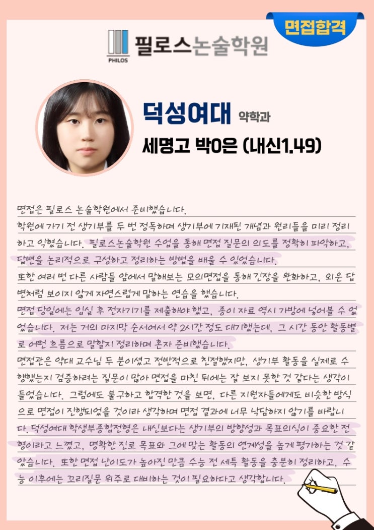안녕하세요. 대구 수성구 면접학원 필로스논술학원입니다. 학생부종합전형으로 덕성여대 약학과 에 합격한 세명고 박O은 학생의 합격 수기를 소개합니다. 덕성여대 약학과 학생부종합전형 합격 수기 면접은 필로스 논술학원에서 준비했습니다. 학원에 가기 전 생기부를 두 번 정독하며 생기부에 기재된 개념과 원리들을 미리 정리하고 익혔습니다. 필로스논술학원 수업을 통해 면접 질문의 의도를 정확히 파악하고, 답변을 논리적으로 구성하고 정리하는 방법을 배울 수 있었습니다. 또한 여러 번 다른 사람들 앞에서 말해보는 모의면접을 통해 긴장을 완화하고, 외운 답변처럼 보이지 않게 자연스럽게 말하는 연습을 했습니다. 면접 당일에는 입....... <img src="https://blogthumb.pstatic.net/MjAyNjAyMTNfMTIx/MDAxNzcwOTgwMDAyOTA2.IVHXqENUMm9UmeC5Q3QmYYb-tFbZJ1BLrorKu6uLYOUg.1q5U1O9eX_ncFCJqNIxJoiQY_GB9Bc4xAapfbE9EcbEg.JPEG/%B9%DA%BC%BC%C0%BA_%B4%F6%BC%BA%BF%A9%B4%EB.jpg?type=s3" />