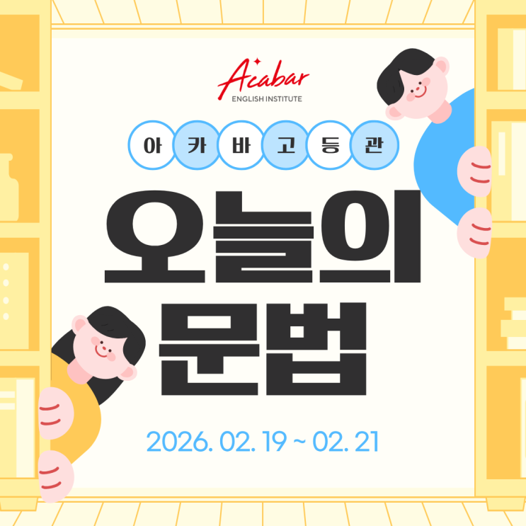 #대구수성구고등영어 #수성구고등영어 #영어문법 #아카바 #아카바고등관 #문법문제 #대구수성구영어 #고등영어 #고등영어문법 #대구수성구영어학원 #고등영어학원 #수성구고등영어학원 #고등영어공부 #수성구내신 #영어모의고사 #영어공부 1. 정확한 정답을 적고, 문법에 맞게 수정한 학생은 정답권을 드립니다! 2. 정답은 1교시 선생님께 제출 해주세요! (정답권 5개를 모으면 재시면제권) 3. 정답 이유를 선생님께 답할 수 있어야 합니다. 4. 1교시가 지나면 제출을 받아주지 않으니 주의! <img src="https://blogthumb.pstatic.net/MjAyNjAyMTlfMjY1/MDAxNzcxNDgxODk2MTEz.clohNEnpu2tuBrvmX7nXvUsOCWlXUYIkY7wD1yb_Kv0g.phV1UWcPQRIURrUPtleVe3mFKaoGDVhRufjb_09d8wsg.PNG/%BD%E6%B3%D7%C0%CF%2802.19-02.21%29.png?type=s3" />