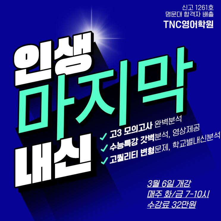 안녕하세요 테크노폴리스 내신대비 잘하는 TNC 영어학원입니다. 2026 본격 내신대비 시스템 안내드립니다. 3월 셋째 주부터 TNC 영어학원은 더욱 촘촘한 내신 대비 시스템으로 운영됩니다. 월·목 / 화·금에는 개별 과제 관리와 단원 테스트를 통해 학생별 약점을 정확히 점검합니다. 누적 오답을 바로잡고, 시험 직전까지 실력을 끌어올리는 구조입니다. 수요일과 토요일에는 학교·학년별 내신 진도반이 운영됩니다. 교과서 분석, 변형 문제, 서술형 대비까지 학교별 맞춤 수업으로 진행됩니다. 단순 문제 풀이가 아니라 시험에 나오는 포인트를 정확히 짚어내는 수업입니다. 고3은 화·금 오후 7–10시, 내신 대비와 모의고사 분석을 병행합니다....... <img src="https://blogthumb.pstatic.net/MjAyNjAyMjZfNTEg/MDAxNzcyMDQyNzQ4OTQx.gD3ZvThuF-IARJ_UlOEle_mj-bUzIi85T7_RMkqysKIg.UFBOJxB2O2w4LFEIsMYZzRmoPRbkV2wibxiuiK9upEwg.PNG/2026%B0%ED3%B3%BB%BD%C5.png?type=s3" />