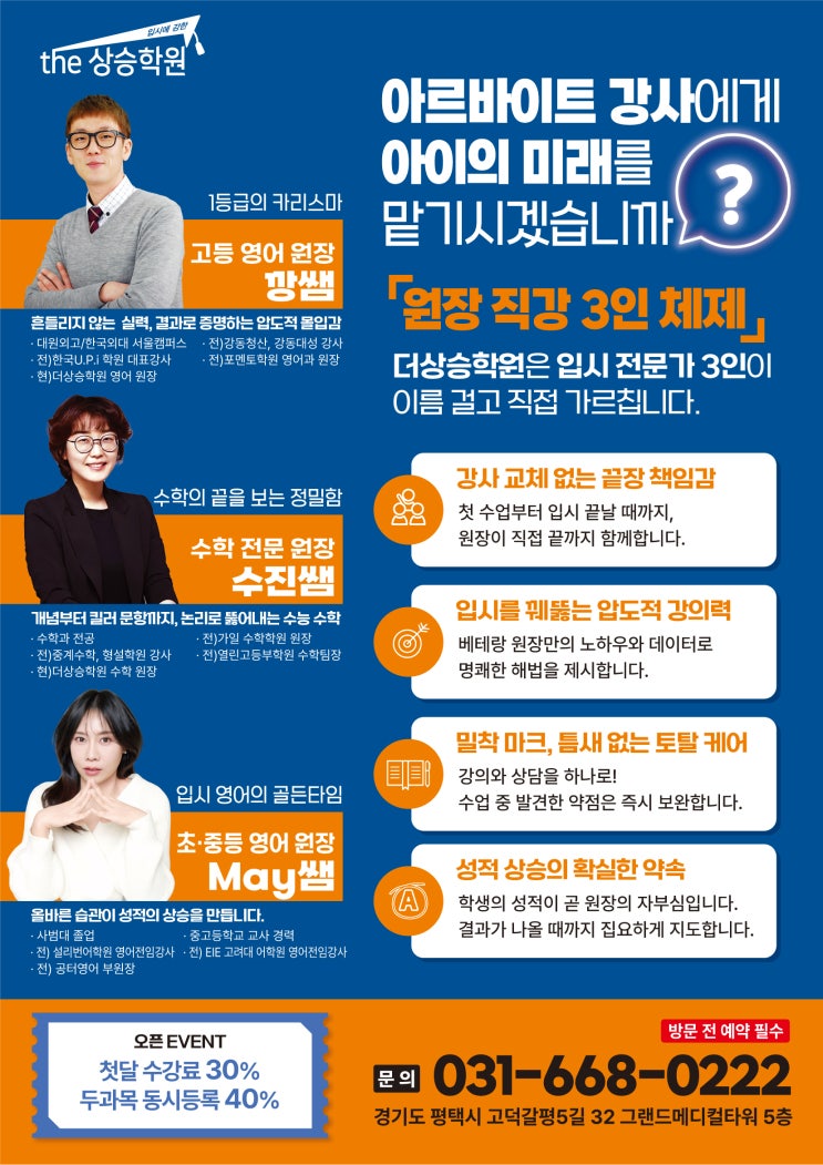 공부는 여기서 끝낸다! 공부 선수촌, 더상승학원 요즘 공부, 여기서 다 합니다. 아르바이트 강사에게 아이의 미래를 맡기시겠습니까? 더상승학원은 원장 직강 3인 체제로 책임지고 가르칩니다. ❓ 아이가 공부에 흥미가 없나요? 지금은 멈춰야 할 때가 아니라, 방식을 바꿔야 할 때입니다. 1학기의 시작은 단순한 새 학기가 아닙니다. 성적의 흐름을 바꿀 수 있는 골든타임입니다. 방학 동안 만들어진 생활 패턴은 개학 후 생활 리듬과 쉽게 충돌합니다. 학교 수업, 수행평가, 동아리, 친구 관계까지 새로운 일정에 적응하다 보면 새 학기 때 세웠던 목표는 금세 흔들리기 마련입니다. 더상승학원은 다릅니다 ✔ 원장 직강 영어 ·....... <img src="https://blogthumb.pstatic.net/MjAyNjAyMjNfMjM4/MDAxNzcxODQyMzYwNzIz.WRtV-0BosgM9WIGCFYvuBrGN0PGLGOz54_JShH_RZdgg.RQFwoipyiNl2cbl854JtEIhAMykTPgU1oAMEL25muOgg.JPEG/%BF%C0%C7%C2%C0%FC%B4%DC%C1%F6.jpg?type=s3" />