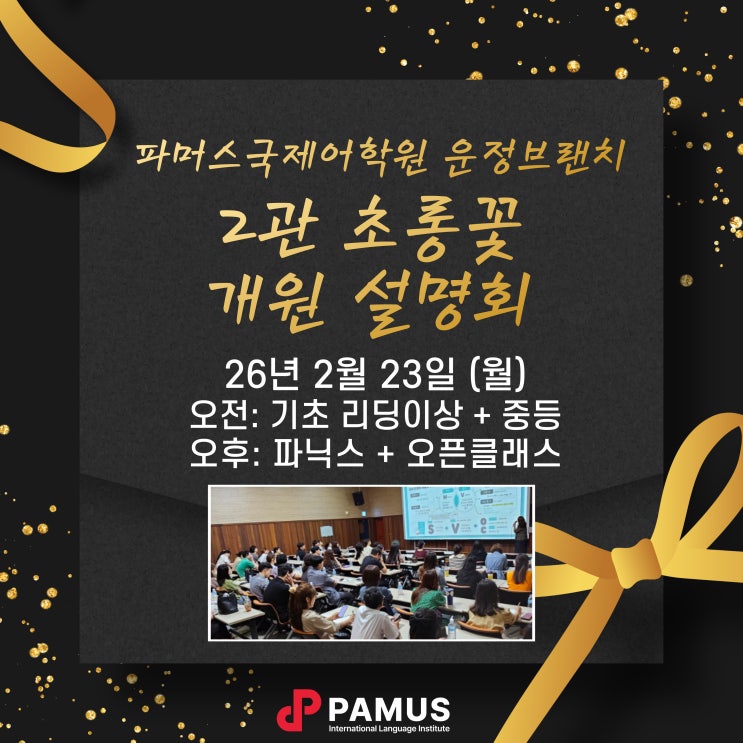 파머스국제어학원 운정브랜치 2관 ✨ 2월 23일(일) 오픈 설명회 안내 ✨ 안녕하세요. 파머스국제어학원 운정브랜치입니다. 많은 학부모님들의 관심과 성원 속에 파머스국제어학원 운정브랜치 2관이 초롱꽃에 새롭게 문을 열게 되었습니다. 이에 앞서, 파머스의 교육 방향과 과정별 학습 로드맵을 직접 설명드리는 2관 오픈 설명회를 진행합니다. 이번 설명회는 ✔ 영어 학습 단계에 맞춘 두 개의 시간대로 나누어 ✔ 학부모님은 물론 학생이 직접 참여할 수 있는 프로그램까지 함께 준비했습니다. 설명회 일정 안내 일시 : 2월 23일(일) 장소 : 파머스국제어학원 운정브랜치 2관 동패동2077 동보빌딩 4층, 파머스국제어학원 오전 10시....... <img src="https://blogthumb.pstatic.net/MjAyNjAyMDlfNTUg/MDAxNzcwNjM4OTE1OTgy.pgUUMzP5csv_OsH0Mw2tQGt7hxFzNnjq44Fkoe1ciGog.uWo18WDzKTmqin3LEFtGS2_bcBzniUoQl4K6NweQ0qkg.JPEG/260130_2%B0%FC%BF%C0%C7%C2%BC%B3%B8%ED%C8%B8-001.jpg?type=s3" />