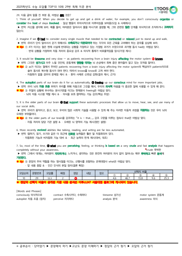 안녕하세요 이투스247학원 서울대점입니다~! 오늘은 2025학년도 수능 영어 영역 오답률 10위인 29번 지문을 분석해보려고 합니다. 함께 살펴볼까요? 1. Think of yourself. When you decide to get up and get a drink of water, for example, you don’t consciously organize or consider the host of steps involved. · 일상 행동이 무의식적으로 이루어짐을 보여줌(도입 & 사례제시) ▶ 번역 :자신을 생각해 보라. 예를 들어, 여러분은 일어서서 물을 마시기로 결정할 때, 그와 관련된 많은 단계를 의식적으로 조직하거나 고려하지 않는다. 2. Imagine if we ①had to consider every single muscle that needed to be contracted or rel....... <img src="https://blogthumb.pstatic.net/MjAyNjAyMjZfNzAg/MDAxNzcyMTA1ODk1NjU5.GfEQh7LHvYBKfec5WFQhyDuiUk_xyHwOAzZKrCzkmcog.agsriZhM-ZMhchEyiwqJMl5UBxUyVBGQNFWKVx5mXT4g.PNG/image.png?type=s3" />