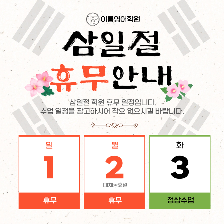 3월1일(일) ~ 2일(월)은 삼일절로 학원 휴무입니다! 일정을 확인해 주시어 수강에 착오가 없으시길 바랍니다. <img src="https://blogthumb.pstatic.net/MjAyNjAyMjNfNzAg/MDAxNzcxODMzMzA3NjIw.UaE0vfJqeVc9gtKZZGzvCcIkk0wVpc7vx1n7xE0cXnEg.K7I9YtWAThhWMhiydfOnV-onRcE9YQJM7YlYrruhsmUg.PNG/%BB%EF%C0%CF%C0%FD_%C8%DE%B9%AB.png?type=s3" />