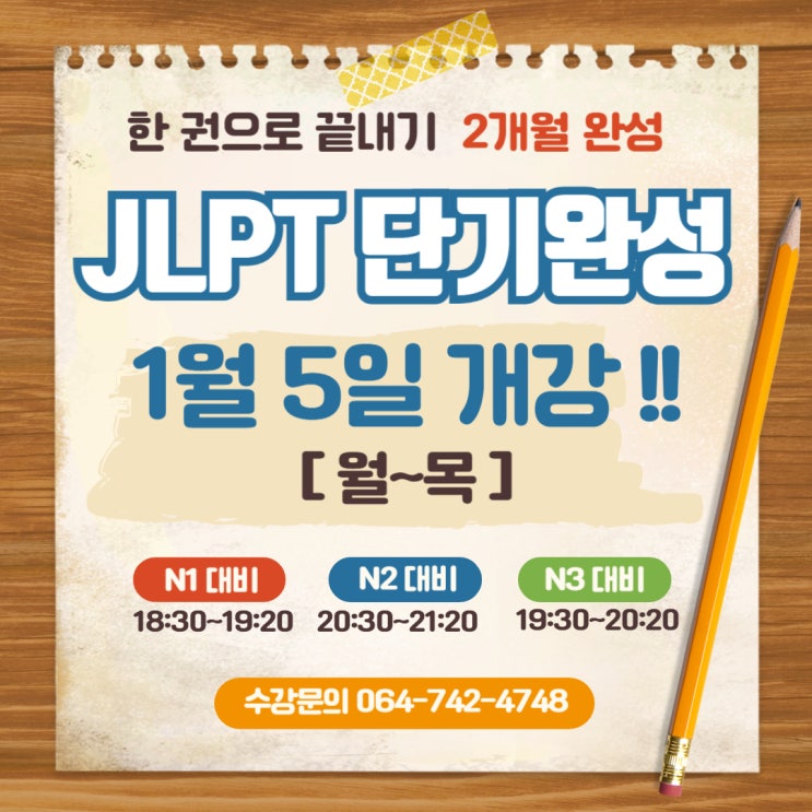 2026년 7월 5일 시험대비 JLPT 2개월 완성 클래스 1월 5일 개강!! 수강접수중!! 2026년 7월 JLPT를 준비하고 계신가요? 그럼 매년 꾸준히 합격생을 배출하고 있는 '신제주일본어학원' 시험대비반이 딱입니다!! 1~2월 2개월 단기과정으로 언어지식(한자, 어휘, 문법), 독해와 청취를 전체적으로 정리할 수 있습니다!! JLPT과정 복습용 영상 (원장 직강) 제공‼️ 수강 접수중‼️ 그리고, 일본대학 진학상담 중입니다‼️ 미리미리 준비하셔야 합니다⏰ 우선 상담신청부터 064-742-4748 #신제주일본어학원 #제주일본어학원 #제주JLPT #제주일본....... <img src="https://blogthumb.pstatic.net/MjAyNTEyMThfMTk4/MDAxNzY2MDQwOTE5OTQ0.dQDc46XJ0KOFtiQ7Aal6MV5FqHA34_ngP48UrjRpxowg._vuKONabmAlBMaQmtc67Zevk531jm1YaKvjPpDsly6wg.JPEG/jlpt%B0%B3%B0%AD%BE%C8%B3%BB_2601-1.jpg?type=s3" />