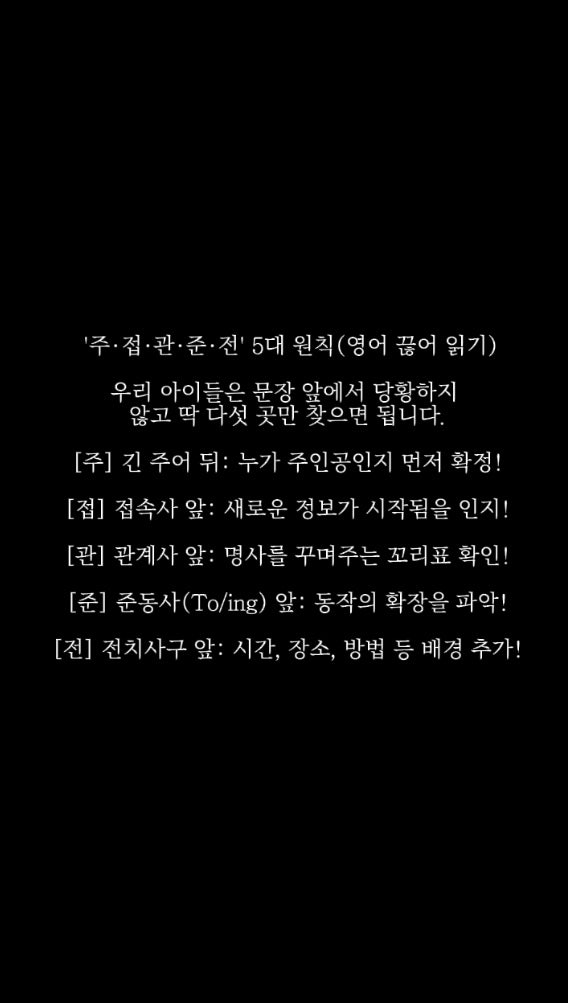 [이곡동영어학원]구글 동시통역의 원리? 이곡동 김용진영어학원의 '끊어 읽기 5대 원칙'이 독해의 레이턴시(Latency)를 없앱니다!** 안녕하세요, 이곡동 영어 교육의 중심 **김용진영어학원**입니다. 우리 아이들이 영어 지문을 읽을 때 가장 많이 하는 실수가 무엇일까요? 바로 문장 끝까지 다 읽은 뒤, 다시 앞으로 돌아와 한국어 어순으로 '조립'하며 해석하는 것입니다. 이렇게 공부하면 시험 시간이 늘 부족할 뿐만 아니라, **'영어식 사고'**가 형성되지 않습니다. 오늘은 저희 학원만의 독보적인 커리큘럼, **[주·접·관·준·전] 5대 원칙**을 소개합니다. --- ### 1. 왜 '끊어 읽기'인가? - 레이....... <img src="https://blogthumb.pstatic.net/MjAyNjAyMjRfMjc4/MDAxNzcxOTIxMTYyNjMw.-97Jn5cTWbt6HwKDIWWzxzMg9rnZjEuDzZjq45S-k5wg.-BPfRxywNct1tBND1pKEc62lXrQrhXd_bDjsZ42oTbcg.JPEG/IMG_2304.jpg?type=s3" />