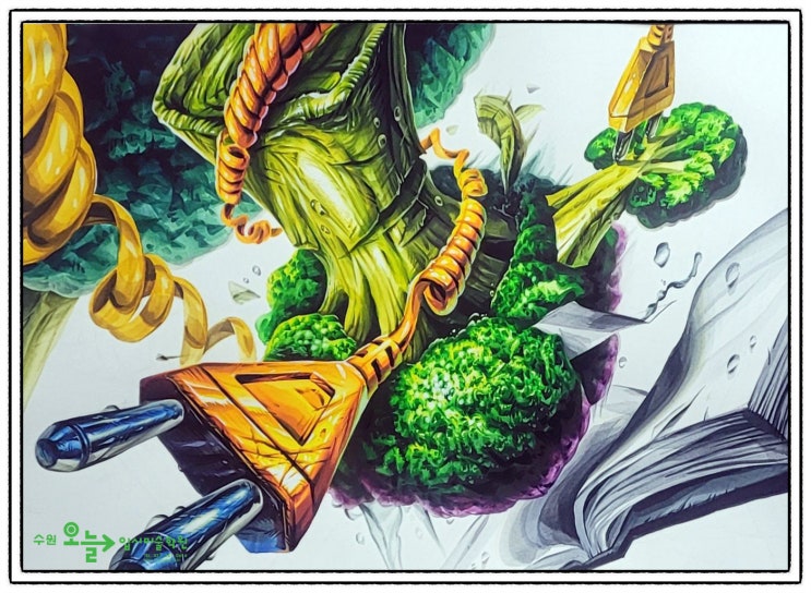 상명대 기초디자인 문제은행에 있는 문제 중 브로콜리, 전기 플러그, 노트를 이용해 준비했어요. '에너지'와 '생명력'이라는 키워드를 시각적으로 풀어 봤습니다. 가장 먼저 눈에 들어오는 것은 화면 앞으로 힘 있게 돌출된 노란색 플러그로 강한 원근 표현으로 공간감이 살아있고 역동성이 느껴집니다. 초록 계열을 중심으로 한 안정적인 색감 위에 오렌지 포인트를 배치해 시선을 자연스럽게 집중 시키고 있습니다. 색의 대비를 활용해 '강조'와 '통일'을 동시에 잡은 구성이 돋보입니다. 브로콜리의 촘촘한 질감 표현, 금속 재질의 반사광, 종이의 부드러운 느낌까지 각 소재의 특성이 명확하게 구분....... <img src="https://blogthumb.pstatic.net/MjAyNjAyMTJfODgg/MDAxNzcwODk4NDQ3NzE5.qszWkYhUMwEuFQBdx7Ih-JFvVwMuX721Qwn6xPFDCCQg.BxNnHRUPXLZrGy-FvcaTG6h0qGzF7NxsXkgNQxOs_dYg.JPEG/20260209_222706_%BA%B9%BB%E7.jpg?type=s3" />