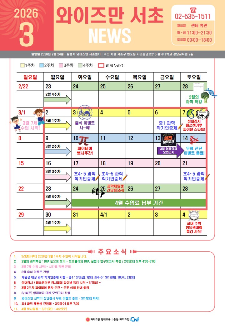 [와이즈만 서초] 2026년 새학기, 3월의 소식지 - 각종 행사와 특강