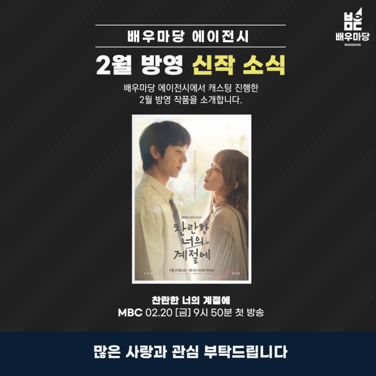 2월 20일 (금) 9시 50분 첫 방송 배우마당 캐스팅 디렉터 : 임나윤, 김장원, 김재윤, 이정은 배우마당 에이전시는 MBC <찬란한 너의 계절에>의 성인, 아역 독점 캐스팅을 맡았습니다. 매일 신나는 여름방학처럼 사는 남자 '찬'과 스스로를 겨울에 가둔 여자 '란'이 운명처럼 만나 얼어 있던 시간을 깨우는 예측 불허 '찬란' 로맨스를 그린 찬란한 너의 계절 많관시부 배우마당 연기학원 X 배우마당 에이전시 -방송 실전을 배우고 캐스팅 디렉터가 함께 있는 곳 <img src="https://blogthumb.pstatic.net/MjAyNjAyMTlfMjgw/MDAxNzcxNDkxMDY3MzEz.3_m-n9oE9FirVV0jWzzoKXAmXQ-ZzYlTLdkafCDEvEcg.sS6o-N3mVSsSGIV3jFqVizQKxtTgoCOraQbsoAQymxYg.PNG/KakaoTalk_20260219_172602334_02.png?type=s3" />