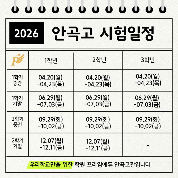 2026년 안곡고 시험 일정 안내 안녕하세요. 안곡고 내신 대비를 전문으로 지도하는 프라임에듀 안곡고관입니다. 안곡고 재학생들과 학부모님들을 위해 2026년 안곡고 시험 일정을 정리해 안내드립니다. 내신 준비는 시험 일정에 맞춰 최소 4~6주 전부터 계획적으로 시작하는 것이 중요합니다. 2026년 안곡고 시험 일정 ✔ 1학기 중간고사 4월 20일(월) ~ 4월 23일(목) ✔ 1학기 기말고사 6월 29일(월) ~ 7월 3일(금) ✔ 2학기 중간고사 9월 29일(화) ~ 10월 2일(금) ✔ 2학기 기말고사 1,2학년 : 12월 7일(월) ~ 12월 11일(금) 3학년 : 없음 안곡고 내신은 시험 범위가 넓고 학교별 출제 스타일이 뚜렷하기 때문에 기출 분석과 학교 맞춤 대....... <img src="https://blogthumb.pstatic.net/MjAyNjAzMTJfMTA5/MDAxNzczMzA4NzUzMDY1.ql-vw0Q5V3svLeSl5hplDdU9N5Bf_jma0pF91nYtatcg.VstNvnE3AaEWkxA-i6TO8mRGB30tASGEqRZwACNx1Skg.PNG/%BE%C8%B0%EE%B0%ED.png?type=s3" />