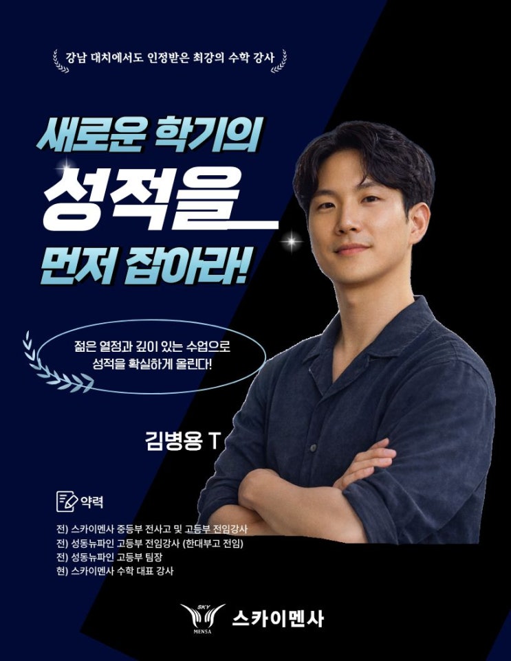 ✔ 목표는 단 하나 단기 점수 상승이 아닌, 스스로 생각하고 해결하는 수학 실력 완성. 수학이 약점인 학생에게는 자신감을, 상위권 학생에게는 확실한 1등급 경쟁력을 만들어드립니다. ● 중2 내신반● ▶화/목 : 18:00~22:00 ▶토 : 첨삭 및 클리닉 ● 고1 내신반● ▶월/수 : 18:00~22:00 ▶토 : 첨삭 및 클리닉 ● 고2 내신반● ▶화/목 : 18:00~22:00 ▶토 : 첨삭 및 클리닉 ● 고3 1등급반● ▶월/수 : 18:00~22:00 ※ 토요일은 약점 보완을 위한 첨삭과 클리닉이 진행됩니다. ※ 철저한 관리와 꼼꼼한 지도로 최상의 성적을 만들겠습니다. 최선의 선택. 0.1% 전문교육 스카이멘사 ☎ 문의: 02-2642-2710 <img src="https://blogthumb.pstatic.net/MjAyNjAzMTdfMjA1/MDAxNzczNzQ5OTIxMTI0.eIIbJDTRkI_cgGeL2XKLvR5Z0VeyomG1jRXk7q0Pdr4g.rrkvoddjer6t_sZ1ntnhesBDZM1f10altqP-n3HJsOsg.JPEG/%B1%E8%BA%B4%BF%EBT_%B0%AD%BB%E7%C7%C1%B7%CE%C7%CA.jpg?type=s3" />