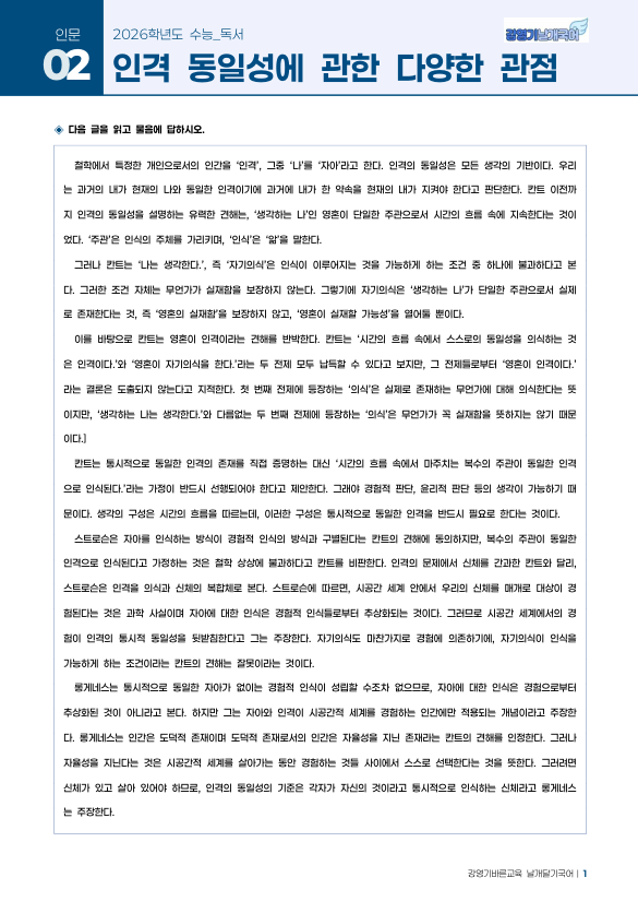 수능기출_내신_인격의 동일성에 관한 다양한 관점_2026_수능특강 독서 인문예술11 인격 동일성에 관한 논의