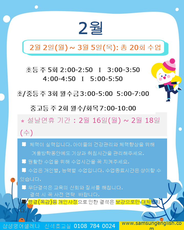 안녕하세요 학부모님 ^^ 2월 소식지 안내해 드립니다. 우선 아시다시피, <삼성영어 셀레나>의 청크 학습법은 문장을 문법에 맞게 구성된 의미 있는 덩어리로 익혀, 원어민의 사고 방식대로 문장을 만든느 영어 엔진을 머릿속에 장착하는 방법입니다. 우리 아이들 BASIC1단계부터 직접 문장을 만들고 링고핏으로 문제 풀이가 온라인과제로 모두 제공되고 있습니다. 그런데 이런 숙제를 게을리 하면 안되겠죠? 방학동안 집에서 패드나 폰으로 <셀레나 말하기와 링고핏 숙제>를 최대한 할 수 있도록 격려 부탁드립니다. 저도 학원에서 잘 활용할 수 있도록 이끌겠습니다. 또 하나 이번 겨울방학 가장 큰 이벤트로는 영단어 경시대회 1월....... <img src="https://blogthumb.pstatic.net/MjAyNjAxMjdfMjg4/MDAxNzY5NDc0NjQ2Mzk5.kDxdfWsO0h8UHGrxKYDdk76J2HAcDJ8peMumYU1YShgg.hNU_EwbtI4OYc7jVk0D_sEHknYw2crqek0ZNaE4sxGEg.PNG/1769390017954.png?type=s3" />