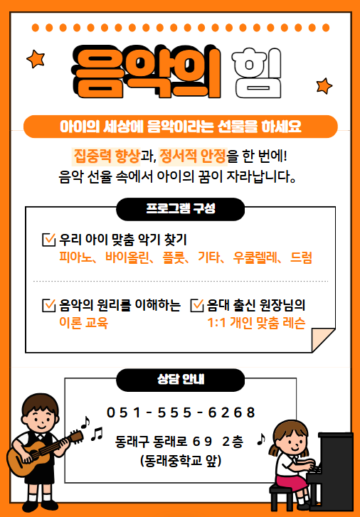 입학 전 유아 / 초중고 학생 / 성인 모든 연령대별로 개인교습을 실시하고 있습니다. 초급 / 중급 / 고급 개인 수준의 알맞은 교재로 눈높이 교육을 실시합니다. 학원에 준비 된 악기로 쉽게 시작 할 수 있습니다. <img src="https://blogthumb.pstatic.net/MjAyNjAzMTVfMTg1/MDAxNzczNTQyODMyMTky.9iSwB1xnN8rcXZoG7i_AkTyzRz0eHswb-T0nLaMOGNsg.QEM4cn_GfjXNTxXzjl5NRZKE-qFAfvZlL_47wp9IquEg.PNG/%B4%D9%BF%EE%B7%CE%B5%E5_%282%29.png?type=s3" />