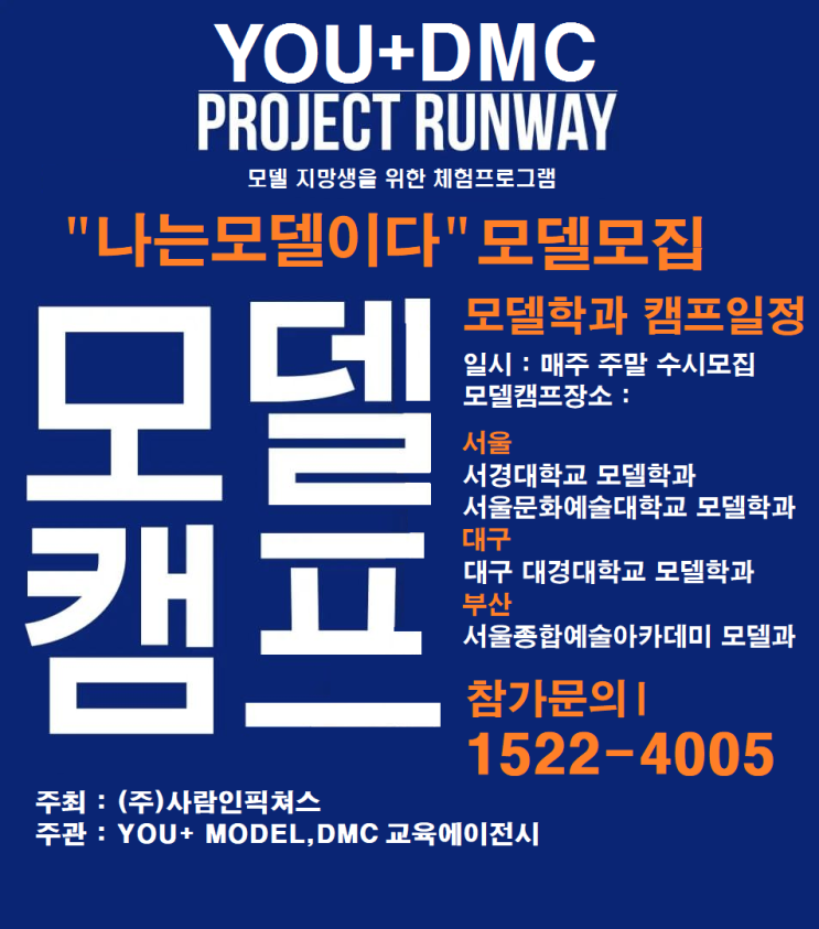 안녕하세요 DMC모델알리미 입니다. 모델을 희망하는 17세~ 19세 미만의 청소년을 2026년 모델캠프에 초대합니다. 모델캠프는 모델 의 직업이 어떤것인지 그리고 모델이 되려면 내가 적합한지 모델이 되기 위한 첫 발걸음이 가벼워 지려면 2026년 모델캠프에 참여 하는것이 바람직 합니다. 모델 직업군에 대해 고민하지말고 2026년 모델 캠프에 참여하셔서 1일 워킹 클래스에 참여하길 바랍니다. 모델캠프 에 참여를 원하시는 청소년 들은 아래 네이버 톡톡으로 문의 남겨주시면 된답니다. 패션모델의 직업군에 대해 자세하게 체험 교육으로 알려드립니다. 2026년 4월 ~ 8월 까지 매주 주말 (토,일) 참가 대상자 : 17세 ~19세 미만 까지 참가 신청....... <img src="https://blogthumb.pstatic.net/MjAyNjAzMjlfMTAx/MDAxNzc0Nzc1ODgzMzQ2.SjxaDjWIELZ917wRwYuUHOCBRGZDQEltnbMU0fs1mX0g.KB5tvMUk0Digc4ud8_E6T0Oqk96PFuFCTiGDj_FYPO0g.PNG/KakaoTalk_20260322_143332318_05.png?type=s3" />