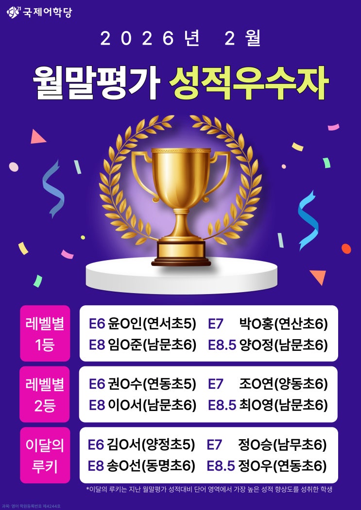 안녕하세요. 국제어학당 본원입니다. 국제어학당 본원의 초등 EDU 2월 월말평가 성적 우수자를 발표합니다. 국제어학당 본원의 초등 EDU는 매번 직전 수업 진도에 따른 학습내용을 점검하게 해주는 Daily Test와 월별 진도를 복습하도록 해주는 월별 Monthly Test로 학생들의 학습을 평가하고 있습니다. 월말 시험 성적우수 학생들에게는 '에듀코인' 적립과 함께 선생님과 친구들의 칭찬의 박수를 함께 전하였습니다. 가정에서도 학부모님의 많은 칭찬과 격려도 부탁드립니다. "오직 국제어학당 본원만이 가능한" 독보적인 학습관리 시스템 "완공 CLASS" 학원등록번호 : 제 4244호 [교습비] 초등(DreamKids-Howdy)....... <img src="https://blogthumb.pstatic.net/MjAyNjAzMzFfMjcw/MDAxNzc0OTM1NzA0NTEz.L6rzgwzKVvqVed8D753mLDAU_HqEQ4heaQQEIPfh5Fcg.udVep8sULWrZYGyI0kpBFURANzmNsQ7nguCwwjwBnW4g.JPEG/E%B7%B9%BA%A7-%BF%F9%B8%BB%C6%F2%B0%A1-%BC%BA%C0%FB%BF%EC%BC%F6%C0%DA-005.jpg?type=s3" />