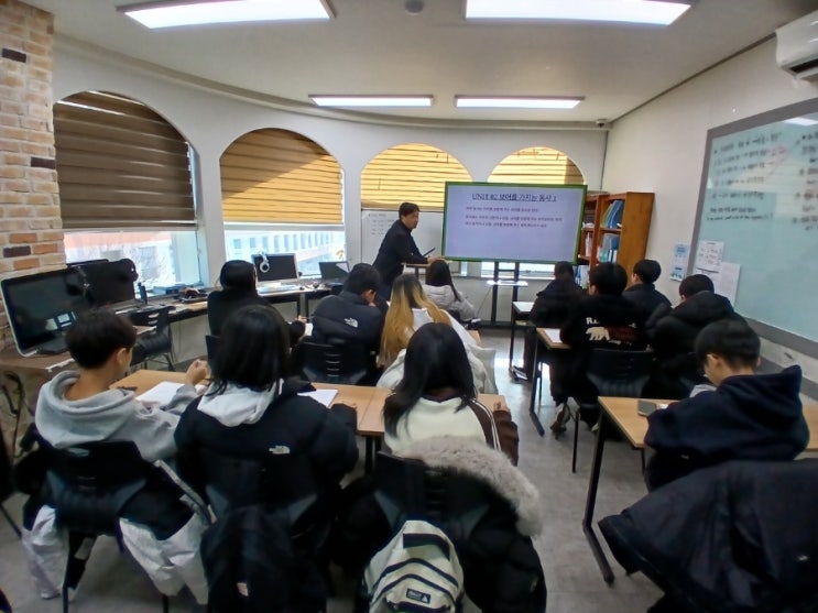1월 마지막주 영문법 2차 특강이 진행되었습니다. 예비중과 중1대상의 비교적 쉬운 문법인 문장의 형식과 To부정사에 대해 6회차 수업을 통해 핵심 문법 요소들 암기하고 시험도 보고 어법 문제도 많이 풀어보는 보람있는 시간이 되었습니다. 막간의 재미로 쪽지시험에서 잘 해준 친구들은 아이스크림 쿠폰도 보내주면서 즐거워하기도 했답니다. 숙제 혼자 하기 어렵다고 일찍 와서 같이 하자며 까르르 하는 예비중들 너무 귀여웠습니다. 이후에 정규수업때 5형식 문제들이 쉬워졌다며 좋아하는 모습도 무척 대견하구요. 영어자신감 장착하고 중학교생활 멋지게 해나가도록 응원합니다! We are improving! 제임스영어 #노은동영어학원 #지족동영....... <img src="https://blogthumb.pstatic.net/MjAyNjAyMDRfMjE1/MDAxNzcwMTg0OTc0MzQ0.Diyjunt6ovr8_d3bSKLtE1N5jRxoyGZpWxO20R2A6gcg.nINgQuGb7a7yeX6CMx0Drkmdmwzvd8olENEcnvF50tIg.JPEG/900%A3%DF20260122%A3%DF130601.jpg?type=s3" />