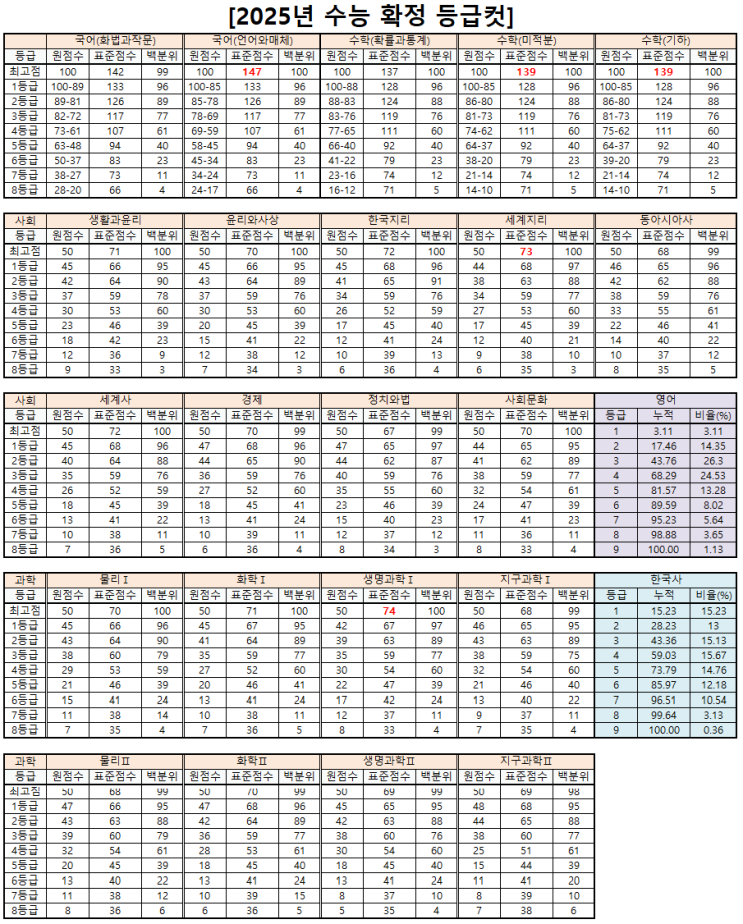 2025년도에 시행 된 대학 수학능력시험의 성적표가 나오고 입시 업체들의 확정 등급컷이 발표 되었습니다. 국어와 수학의 표준점수 최고점과 영어의 1,2등급의 비율을 보면 확실히 어려운 수능이었음이 확인되었네요. 2025학년도 수능 확정 등급컷을 한눈에 보기 좋도록 정리해서 올려봅니다. 국어와 수학은 선택영역에 따라서 동일 원점수에도 다른 표준점수가 나올 수 있으니 참고해서 보시고 등급컷의 소스는 대성마이맥의 발표결과를 참고하였습니다. 국어,수학의 등급 백분위 표준점수의 도수분포입니다. 표준점수별 백분위는 오르비의 크럭스테이블이 제공하는 데이터로 정리하였습니다. 아래는 수능 응시자의 과목선택에 따른 여러가지 현....... <img src="https://blogthumb.pstatic.net/MjAyNTEyMDdfNjEg/MDAxNzY1MDk2MjU4NDM4.RlrOlV9yisx9gq9w04lacRe2PKDMXgt8JCNr3Vflo4Qg.n1mrl5ikJahrj72Pw9nMtuxlNu_Bx0tmpIhwRtxKen0g.PNG/image.png?type=s3" />
