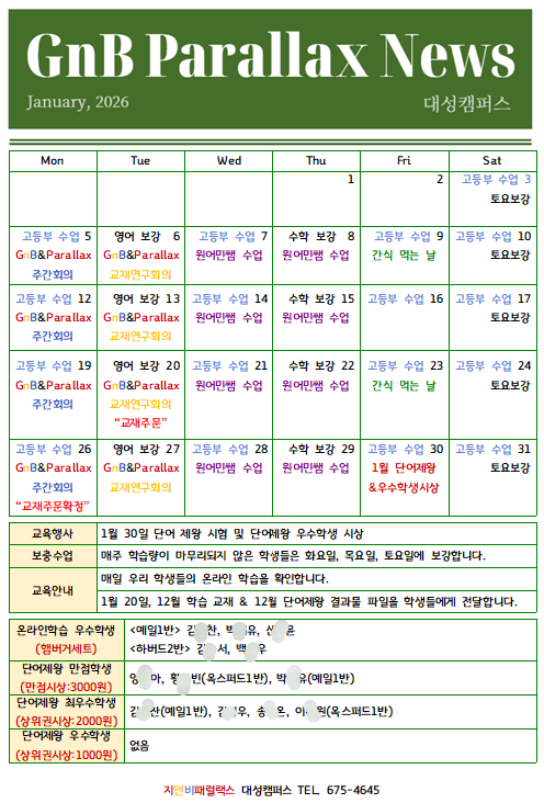 안녕하세요. GnB Parallax 대성캠퍼스입니다. 2026년 새해와 함께 학원 운영 시스템에도 몇 가지 중요한 변화가 있어 1월 소식지를 통해 안내드립니다. ✅ 보강 수업 요일 확대 안내 2026년부터 보강 요일이 기존보다 확대되어 총 3일로 운영됩니다. ✔️화요일 ✔️목요일 ✔️토요일 학습량이 마무리되지 않은 학생들은 해당 요일에 보강을 통해 그날 배운 내용은 반드시 소화하고 넘어가도록 지도합니다. 1월 20일(화) - 교재 주문 & 12월 결과물 배부 1월 20일은 두 가지 중요한 일정이 함께 진행됩니다. * 교재 주문일 * 12월 학습 결과물 배부 한 달 동안 아이들이 얼마나 성실하게 공부했는지 과정과 결과가 담긴 자료....... <img src="https://blogthumb.pstatic.net/MjAyNjAxMDhfMjc1/MDAxNzY3ODM3MTk0ODQ2.I49DEA_lkcTXeyg5pN-V3FBCWnUpxgCuvZV1ACSMoRYg.7uXFKbT6WyQGrAt_WZfJ_LGXXrhDOBHY2d6Jg71z7Zkg.PNG/1767713857831.png?type=s3" />