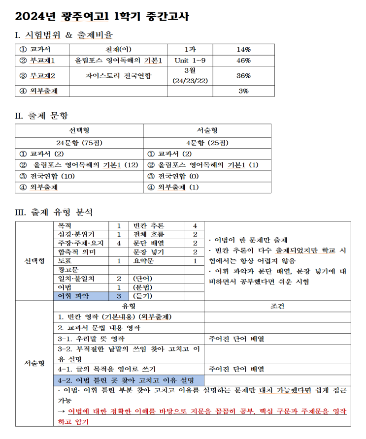 1. 시험 기본 정보 2. 전체 구성 분석 3. 문항별 세부 분석 4. 핵심 문항 심층 분석 5. 메이블 종합총평 --------------------------------------------- 메이블에서는 시험직후 출제유형 분석과 모든시험지의 한글 문서화 작업을 통해 매년 지도 하고 있습니다. 아직 시험을 보지 않은 학생들에게는 좋은 자료가 되고 또한 내년, 내후년에 후배들에게 많은 도움이 되기도 해서 문서화 작업외에 중고등 기출 유형 분석을 하고 있습니다. 그리고 시험직전에 시중문제집이나 학원에서 만든 시험대비서도 도움이 되기는 하지만 학생들에게 본인 학교 또는 비슷한 학교의 기출을 직접 풀어보고 분석을 듣는 것은 실질적인 도움 뿐만 아니라 마음적으....... <img src="https://blogthumb.pstatic.net/MjAyNjAzMTRfMTY3/MDAxNzczNDk5NTYxMzc2.Ib8oEtSwuuRAbo-te1jtQjcgn3oLx9Kjn1iS6CjH55Yg.vJ6TshYZXbJNVG7wpfGgE-hsTncTOry4itmTneJDmPgg.PNG/image.png?type=s3" />