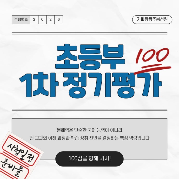 안녕하세요, 기파랑문해원 봉선원 초등부입니다. 벌써 1월의 끝자락에 다가왔습니다. 한 달 동안 아이들이 꾸준히 쌓아온 학습의 발자취를 돌아보며, 그간의 노력이 결실을 맺는 시점이 다가왔습니다. 이를 위해, 학부모님과 학생 여러분께 1차 정기평가 일정 을 안내드립니다. 1차 정기평가를 통해 한 달 동안의 학습 과정을 되짚어보고, 아이들의 문해력 성장과 학습 이해도를 점검하는 중요한 시간이 될 것입니다. 이번 평가를 통해 아이들이 어느 부분에서 잘 성장했는지, 어떤 부분에서 더 보완이 필요한지를 명확히 파악할 수 있을 것입니다. 또한, 평가 결과를 바탕으로 앞으로의 학습 방향을 설정하고, 보다 체계적인 학습 계획을 세....... <img src="https://blogthumb.pstatic.net/MjAyNjAxMjhfNzUg/MDAxNzY5NTgwNzIyMzk3.re6M_ZhAmB8fPl_Jc8R9zrMkq3svhDE1orTOT6cV_bMg.Ee5KaulcI9iXIOjcIEPTjC1tAv47hPBLdMZ3QOUrr58g.JPEG/%C1%A6%B8%F1%C0%BB_%C0%D4%B7%C2%C7%D8%C1%D6%BC%BC%BF%E4..jpg?type=s3" />