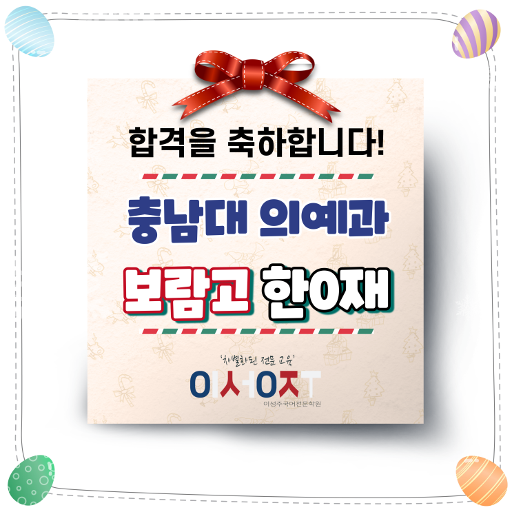 0재야, 합격 소식을 전하는 너의 밝은 목소리를 들으니 선생님도 너무 기쁘다. 수시 합격도 힘든데, 충남대 의예과에 정시로 합격하다니! 합격을 정말 정말 축하한다! 선생님 마음도 뻥 뚫린 것처럼 시원하고 뿌듯하다. 중3 때부터 고3까지 3년 넘는 시간을 함께하다 보니 더 특별하게 느껴지는 것 같다. 묵묵히 노력해 준 네가 정말 자랑스럽다. 대학에 가서도 지금처럼 진지하고 성실한 모습으로 공부해서 훌륭한 의사가 되길 바란다. 훗날 선생님이 아프면 치료도 해 주고~~ㅎ 다시 한 번 진심으로 축하해~~! <img src="https://blogthumb.pstatic.net/MjAyNjAyMDNfMjI5/MDAxNzcwMTEyMjE3OTMz.hjjyiIogGAGipoeK5Sb6eoyUGf-kKzkHFknLOpSJvWog.OlheiCfLlPIz2dRYQVjQbEgVnX8dGZUU6prSMJiQ864g.PNG/%C7%D1%BF%B5%C0%E7_%C3%E6%B3%B2%B4%EB_%C0%C7%BF%B9%B0%FA.png?type=s3" />