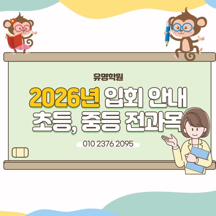 안녕하세요, 유명학원입니다 :) 2026년 초중등 전과목 종합반 인원 티오 및 입회 안내드립니다. 각 학년 별도 1~2명씩만 티오가 있으며 이미 고학년은 마감된 반도 있습니다. 개인 사정 및 이사 등 다양한 이유로 티오 변동이 있으니 수시 확인 부탁드립니다! (확인은 전화 또는 문자로 가능합니다) 교육비 안내 초등 3학년 33만원 초등 4학년 35만원 중등부 45만원 상담문의 010 2376 2095 <img src="https://blogthumb.pstatic.net/MjAyNjA0MDJfNSAg/MDAxNzc1MTM1MTMwMDg5.7dM6G5nkODs9mf9ndOnLauhOIvEw5L1GxAmj7qxuD6Qg.s0x7wEJ0uF24fX3q6m2gBrVxiIYxBOZ20xP8mof8xiog.JPEG/001.jpg?type=s3" />
