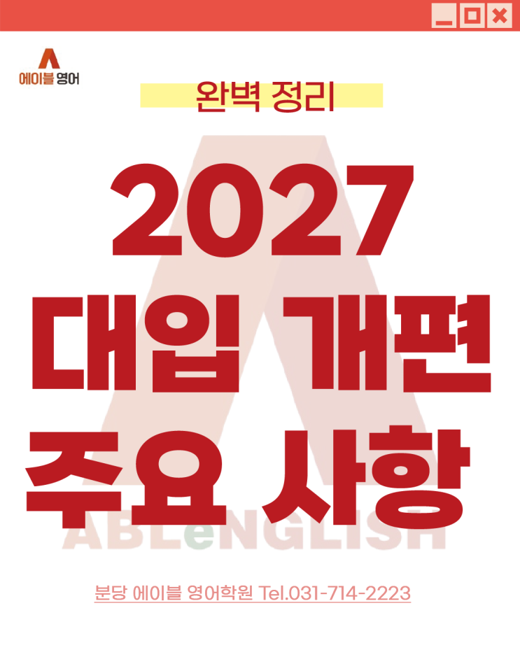 안녕하세요, 수능과 내신은 에이블이 답이다! 분당영어학원 에이블영어학원입니다. “고2인데 아직 시간 많다고요? 2027 입시는 이미 시작됐습니다” 최근 2027학년도 대학 입학전형이 주요 대학을 중심으로 발표되면서 입시의 방향이 완전히 달라지고 있습니다. 많은 학부모님들께서 이렇게 생각하십니다. “고3 올라가서 준비하면 되지 않나요?” “내신만 잘 챙기면 되는 거 아닌가요?” 하지만 이번 변화의 핵심은 분명합니다. 이제는 ‘하나만 잘해서’는 절대 합격할 수 없는 구조입니다. 내신만으로 부족하고 수능만으로 부족하고 비교과만으로도 부족합니다 모든 요소를 동시에 설계해야 하는 입시로 바뀌었습니다. 1. 학생부교과전형 변....... <img src="https://blogthumb.pstatic.net/MjAyNjA0MDJfMjkg/MDAxNzc1MTI1ODg4MjIz.x0qJb-BeJW4ayL1huJlWNSMC9gh0lSrJMnUStyqbjsEg.lquqX39Nthb7_NrQ7GU_VOFTLh7ajKT15vhp2HyXdRgg.PNG/%BE%C6%C6%AE%BA%B8%B5%E5_2.png?type=s3" />