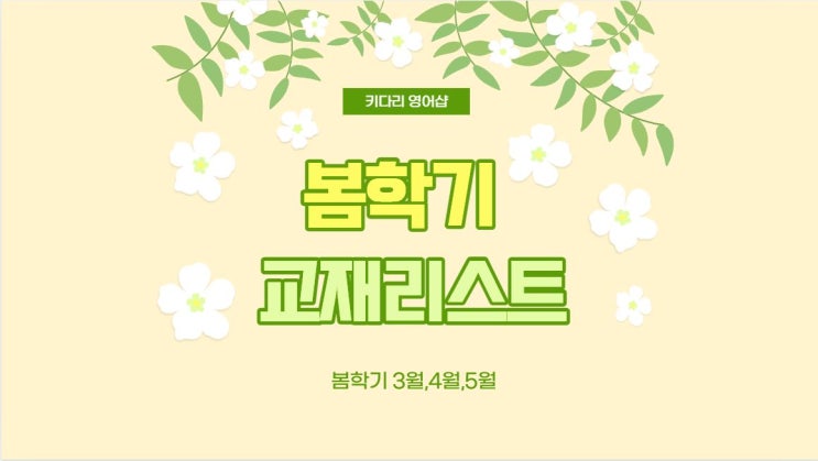 분당 유초등 영어교육센터 키다리영어샵입니다. 봄학기에 진행되는 수업시간표와 각 수업에서 사용할 교재를 안내드립니다. 스토리 수업 그림책을 기반으로 모국어 습득에 가장 가깝게 진행되는 수업입니다. 4-5세의 유아들부터 초등저학년까지 다양한 연령을 위한 수업이 개설되어 있어요. Eena Story Ava Story Alice Story Green/Orange Story Nicky Story Science + Social Nonfiction Readers 논픽션 리더스 수업입니다. 스토리북에서는 접하기 어려운 어휘와 표현을 익힐 수 있을 뿐만 아니라 다양한 배경지식을 습득할 수 있어요. Spotlight On Literacy 4-7세 아이들의 리터러시 계발을 위한 수업인 SOL수업입니다. 파닉스리딩 실제 아이....... <img src="https://blogthumb.pstatic.net/MjAyNjAxMjlfMTg2/MDAxNzY5Njc0MjY1NDE2.ybh4HYAaji5X5H1IbZzUAjbXdifOPsrEUB4JU1MTlSYg.4walpnFPnvApO0t6aE7i9Inn1VxmVsik7Y6snQA0RpAg.JPEG/%EB%B4%84%ED%95%99%EA%B8%B0%EA%B5%90%3F%9E%AC%EB%A6%AC%EC%8A%A4%3F%8A%B8.JPG?type=s3" />