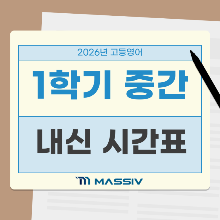 매시브영어 [2026] 매시브 고등영어 1학기 중간고사 내신 시간표! 안녕하세요 매시브 학원입니다. 요즘 학원으로 고등학교 1학기 내신반 시간표 문의가 많이 오고 있는데요? 매시브영어 고등 내신 시간표가 궁금하신 분들을 위해 한눈에 보기 쉽도록 시간표를 정리해 왔습니다! 2026년 매시브 고등영어 시간표가 궁금하다면? 아래 글을 참고해주세요! 모든 학생들이 탐내는 매시브 고등영어 내신의 압도적인 자료 라인업! 학교별 전담 강사님들이 출제 경향 분석 후 매 시즌 100% 직접 제작하시는 고퀄리티 내신 자료 수업 X 자료 X 관리 = 성적 향상 고등영어 내신 매시브와 함께라면 두렵지 않습니다. [2026년 매시브 고등영어 1학년 내신....... <img src="https://blogthumb.pstatic.net/MjAyNjAxMzFfOTIg/MDAxNzY5ODI3NTI0NTAx.kmRsURFaRAR52_LPLquH1vQptKYdokKicQmlKYu-CBsg.DCUIlmzUsTqyDMqhSIsj69ZmiY8opBIF4kTbss5eecsg.PNG/001.png?type=s3" />