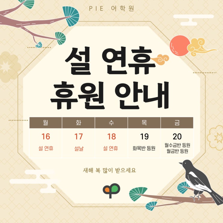PIE어학원 2026년 설날(구정) 연휴 안내