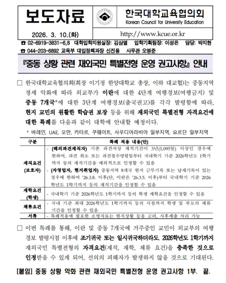 [재외국민 특례전문] 중동 상황 관련 재외국민 특별전형 운영 권고사항 안내