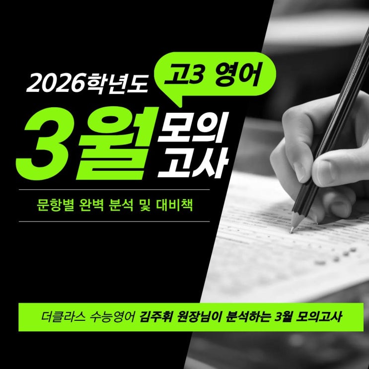 작년 3월에 비해서 고난이도 문제는 2문제밖에 출제되지는 않았습니다. 그럼에도 불구하고 3월 모의고사 체감 난이도가 높았던 이유들이 있습니다. 분당 수내동 수능 영어 전문 논리 영어 '김주휘원장님' 2026년 고3 3월 모의고사 총평☞☞☞ 우선 전체적으로 지문의 난이도가 높아서 상위권을 유지하던 학생들도 읽히지가 않는다는 말들이 많았고요. 두 번째로는 기본 문제라고 생각을 많이 하는 주장, 제목, 무관한 문장 등의 문제들에 시간을 끌게 되면서 전체적으로 시간이 너무 모자랐다는 평가가 주를 이루었습니다. 이번 모의고사에 또 하나의 특징은 추상적이고 어려운 소재를 정제되지 않은 채 마구잡이식으로 늘어뜨리고, 길....... <img src="https://blogthumb.pstatic.net/MjAyNjAzMzBfMTg4/MDAxNzc0ODMwNjc5ODIx.6v31RPXcLf2YnU8GZBlZ2JJcELNrb31FD7IFeZQPMoEg.eQcAV9kqK309OPNxA5Wx4-euGkFPXdjXiKXBn0sMMx8g.JPEG/%B4%F5.jpg?type=s3" />